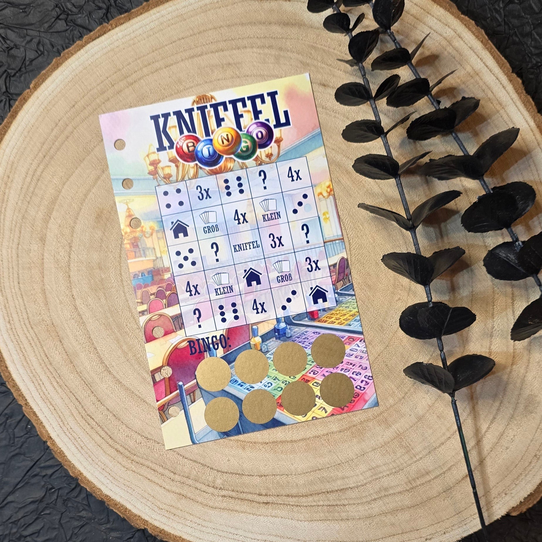Versuche mit deinen Kniffel-Kombinationen möglichst viele Bingos zu generieren. Die Anleitung befindet sich auf der Rückseite.