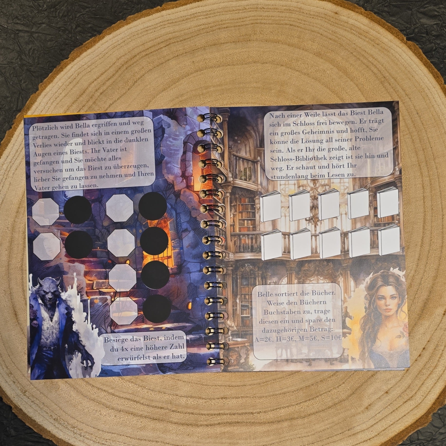 Folge der Geschichte Seite für Seite, indem du die entsprechenden Aufgaben löst und sparst.